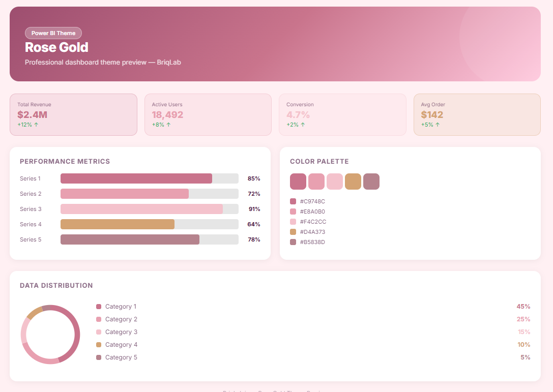 The Rose Gold is a rose gold Power BI theme designed for luxury retail, beauty, and premium brand dashboards where the visual environment must carry the same warmth, elegance, and understated sophistication as the products, collections, and brand experiences being reported on. This Power BI theme draws from a refined palette of burnished rose gold, soft champagne pink, warm copper, and blush ivory tones set against composed light or dark neutral backgrounds — a combination that projects an unmistakable sense of premium femininity, modern luxury, and considered aesthetic refinement across every chart, KPI card, and brand performance layout. The warmth and lustre of the rose gold palette creates a report environment that feels inherently aspirational and brand-aligned — guiding beauty directors, luxury retail analysts, and premium brand managers through product performance data, collection analytics, and customer lifetime value metrics with a visual language that reflects the elevated positioning of the brands it serves. Deeper rose gold accent tones provide precise visual hierarchy and multi-series data differentiation while maintaining the cohesive, warm-toned elegance that defines the overall design identity. It is particularly well-suited to luxury beauty brands, premium cosmetics retailers, fashion jewellery companies, high-end skincare organisations, and luxury lifestyle businesses building dashboards for product range performance, retail sales analytics, brand campaign measurement, customer acquisition reporting, and premium segment tracking. Brand strategists, beauty analytics teams, and luxury retail directors who need reports that communicate the same warmth, refinement, and premium positioning as the brands they represent will find this palette an immediately and precisely aligned fit. The theme is delivered as a JSON file fully compatible with all versions of Power BI Desktop and straightforward to deploy across your complete report suite in seconds. Download this rose gold Power BI theme, import the JSON file into Power BI Desktop, and give your luxury retail and beauty industry dashboards the elegant, warm-toned visual identity that premium brand analytics and sophisticated reporting excellence deserves.
