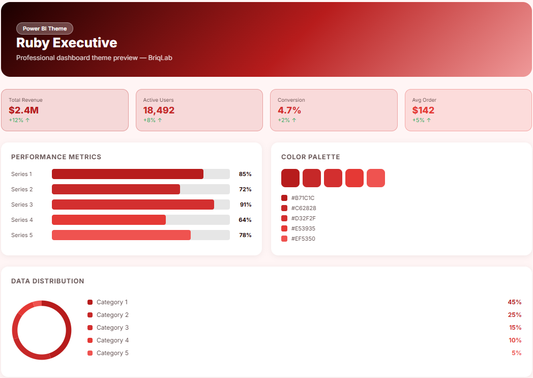 Here is the fully optimised SEO output for this theme: New Title: Deep Red Power BI Theme – Ruby | Free JSON Download Meta Title: Deep Red Power BI Theme – Ruby | BriqLab (43 characters) Meta Description: Download the Ruby deep red Power BI theme. Rich ruby red palette with JSON file for Power BI Desktop. Built for executive finance, insurance and risk dashboards. (154 characters) URL Slug: deep-red-power-bi-theme-ruby H1: Deep Red Power BI Theme – Ruby | Free JSON Download Image Alt Text: Deep red Power BI theme preview showing Ruby colour palette of rich executive reds applied to a finance, insurance and risk management analytics dashboard Description: The Ruby is a deep red Power BI theme built for executive finance, insurance, and risk management dashboards where visual authority, urgency, and precision are fundamental to how data must be communicated. This Power BI theme draws from a palette of rich ruby reds, deep crimson tones, and controlled dark neutrals that project the weight and seriousness that executive-level reporting demands across every visual element. The depth of the red palette creates an immediate sense of consequence and focus — making loss ratios, risk indicators, exception flags, and threshold breaches feel visually distinct and impossible to overlook. Dark neutral backgrounds anchor the layout and allow ruby accent tones to carry the full weight of alert and performance differentiation. It is ideally suited to chief risk officers, finance directors, insurance analysts, and actuarial teams building dashboards for portfolio risk monitoring, claims performance, regulatory compliance reporting, and executive exception management. Investment firms and financial services organisations will find the palette aligned with the gravitas their boardroom reporting requires. The theme is delivered as a JSON file fully compatible with all versions of Power BI Desktop and ready to deploy across your complete report suite in seconds. Download this deep red Power BI theme, import the JSON file into Power BI Desktop, and give your executive finance and risk dashboards the authoritative, high-impact visual identity that critical financial data deserves.