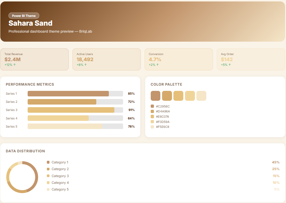 The Sahara is a desert sand Power BI theme crafted for real estate, construction, and property development dashboards where the visual tone needs to feel as grounded, reliable, and enduring as the built environments being reported on. This Power BI theme draws from a warm, considered palette of desert sand, sun-bleached dune, raw sienna, and dry earth tones that bring an immediate sense of solidity and trustworthiness to every chart, KPI card, and report layout. Layered warm neutrals create a natural visual hierarchy that guides stakeholders through property pipeline data, land valuation metrics, and construction programme reporting with unhurried clarity. Earthy accent tones provide structure and differentiation across data categories without disrupting the cohesive, grounded character of the overall palette. It is particularly well-suited to property developers, construction firms, land surveyors, and real estate investment organisations building dashboards for site development tracking, planning pipeline analytics, building cost performance, and portfolio land valuation reporting. Infrastructure and civil engineering teams will find the palette equally aligned with the scale and substance of their operational data environments. The theme is delivered as a JSON file fully compatible with all versions of Power BI Desktop and straightforward to deploy across your complete report suite in seconds. Download this desert sand Power BI theme, import the JSON file into Power BI Desktop, and give your real estate and construction dashboards a warm, earthy visual identity that communicates the solidity and trustworthiness that property and land data demands.