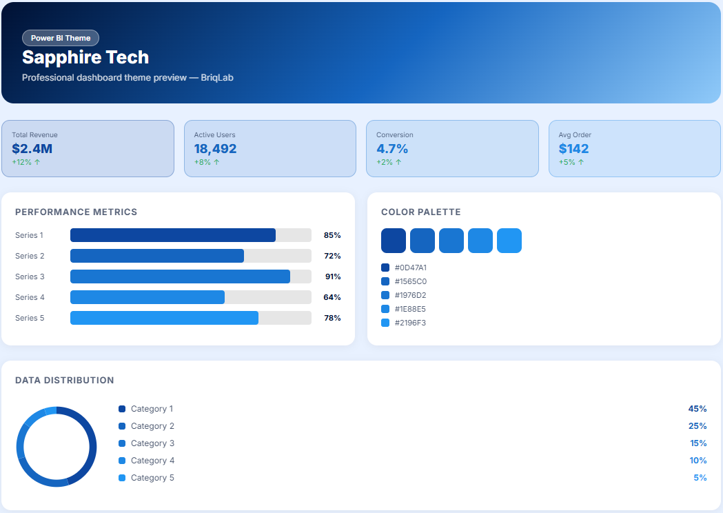 The Sapphire Tech is a sapphire blue Power BI theme engineered for enterprise technology, IT infrastructure, and software analytics dashboards where visual hierarchy and layered data clarity are as important as the metrics themselves. This Power BI theme is built around a deep-to-light sapphire blue gradient sequence that creates a natural, intuitive pathway through complex data — guiding analysts and stakeholders from headline figures down through drill-through detail with effortless visual logic. The gradient progression moves from rich midnight sapphire through to crisp, lighter blue tones, giving each data layer its own distinct visual weight without breaking the coherence of the overall palette. The result is a report environment that feels structured, intelligent, and unmistakably enterprise-grade. It is particularly well-suited to IT operations teams, enterprise software vendors, cloud service providers, and technology consultancies building dashboards for system performance monitoring, infrastructure health, SaaS metrics, and technology portfolio reporting. Data engineering and DevOps teams will find the layered colour logic especially effective for multi-level drill-down reports. The theme is delivered as a JSON file fully compatible with all versions of Power BI Desktop and straightforward to deploy across your entire report library in seconds. Download this sapphire blue Power BI theme, import the JSON file into Power BI Desktop, and give your enterprise tech and IT dashboards a precise, gradient-driven visual structure that makes complex layered data immediately navigable.
