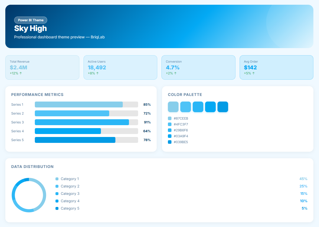 The Sky High is a sky blue Power BI theme designed for retail, logistics, and supply chain dashboards where an open, expansive visual environment communicates the clarity, transparency, and operational visibility that inventory and distribution reporting demands at every level. This Power BI theme draws from a light, airy palette of sky blue, soft horizon tones, and clean pale azure that brings a sense of spaciousness and uncluttered calm to every chart, KPI card, and supply chain performance layout across the report environment. The lightness and expansiveness of the sky blue palette creates a report environment that feels naturally organised and easy to navigate — allowing logistics managers, retail buyers, and supply chain analysts to move through inventory data, stock level metrics, and distribution performance indicators with effortless visual flow. Deeper blue accent tones provide precise structural hierarchy and data differentiation while preserving the overall sense of openness and clarity that defines the palette. It is particularly well-suited to retail operations teams, logistics providers, warehouse management organisations, and e-commerce fulfilment businesses building dashboards for inventory tracking, stock replenishment analytics, supplier performance reporting, and distribution network monitoring. Supply chain directors and retail operations managers who need reports that communicate transparency and operational control in equal measure will find this palette a clean, immediately functional fit. The theme is delivered as a JSON file fully compatible with all versions of Power BI Desktop and ready to deploy across your complete report suite in seconds. Download this sky blue Power BI theme, import the JSON file into Power BI Desktop, and give your retail and logistics dashboards the light, airy visual identity that brings openness, clarity and expansive visibility to every layer of your supply chain data.