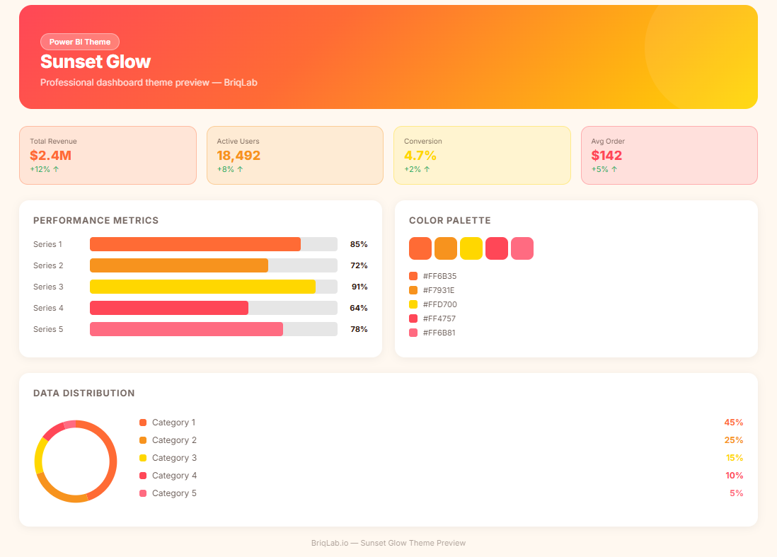 The Sunset Glow is a sunset glow Power BI theme designed for marketing, retail, and creative industry dashboards where warm, energetic colour, immediate visual impact, and an inspiring sense of creative momentum need to radiate through every chart, KPI card, and campaign performance layout across the report environment. This Power BI theme draws from a richly layered palette of burnt orange, sunset coral, amber gold, and deep horizon red tones that together recreate the warmth, energy, and visual drama of a natural sunset — bringing an instinctive sense of vitality and creative confidence to every report it powers. The warmth and intensity of the sunset orange and red palette creates a report environment that feels inherently dynamic and attention-commanding — directing marketing directors, retail analysts, and creative strategists toward campaign highlights, sales performance peaks, and trend inflection points with a colour energy that makes critical data impossible to overlook. Layered amber and coral accent tones provide natural visual hierarchy and precise data differentiation across multi-series marketing and retail visuals while preserving the cohesive, warm-toned character of the overall design. It is particularly well-suited to marketing agencies, retail brands, creative consultancies, e-commerce operators, and consumer goods organisations building dashboards for campaign performance tracking, retail sales analytics, brand engagement measurement, seasonal trend reporting, and product launch performance monitoring. Creative directors, brand strategists, and marketing analytics teams who need reports that carry the same warmth, energy, and visual confidence as the creative work and commercial ambition they represent will find this palette a vivid and immediately compelling fit. The theme is delivered as a JSON file fully compatible with all versions of Power BI Desktop and ready to deploy across your complete report suite in seconds. Download this sunset glow Power BI theme, import the JSON file into Power BI Desktop, and give your marketing and retail dashboards the warm, energetic visual identity that sunset-inspired colour and creative commercial reporting excellence demands.