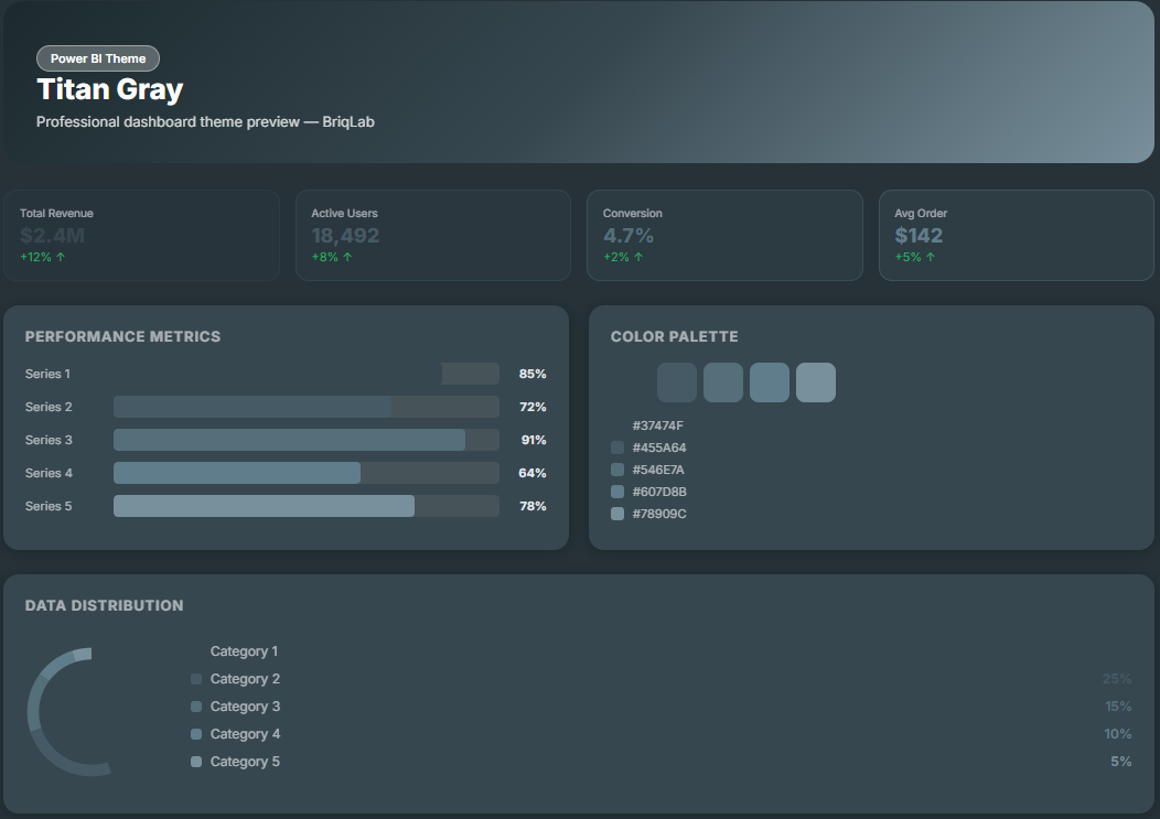 The Titan is a dark industrial Power BI theme built for technical, engineering, and operations dashboards that demand precision and clarity in every visual. This Power BI theme draws from a refined palette of titanium silver and deep gunmetal grey tones, layered to create a mechanical, high-contrast aesthetic that mirrors the environments it is designed for. Cool-toned grey gradients anchor the layout while structured accent colours highlight critical KPIs and data points without visual noise. The overall design language is clean, calculated, and purposeful — reflecting the discipline of engineering and industrial operations. It is an ideal fit for automotive, aerospace, and manufacturing organisations where technical reporting, production metrics, and operational performance data need to be communicated with authority. BI developers working in heavy industry or infrastructure will find the visual hierarchy particularly well-suited to complex, data-dense reports. The theme is delivered as a JSON file ready for import into Power BI Desktop across all supported versions. Download this dark industrial Power BI theme, apply the JSON file to your reports in seconds, and bring a refined mechanical precision to every dashboard your team builds